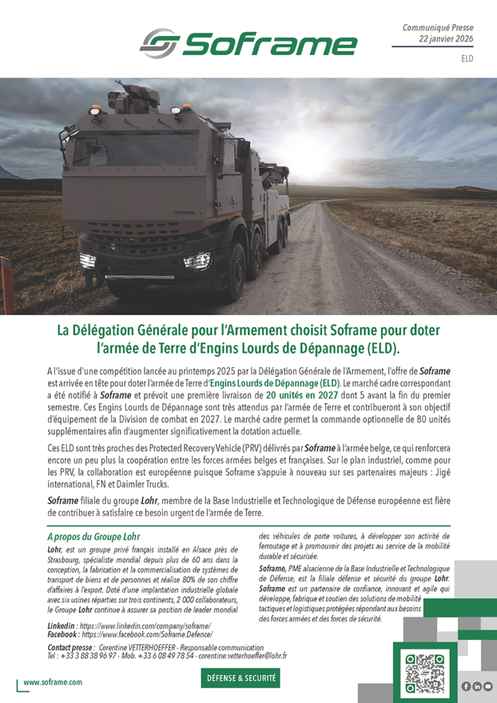 À l’issue d’une compétition lancée au printemps 2025 par la Délégation Générale de l’Armement, l’offre de Soframe est arrivée en tête pour doter l’armée de Terre d’Engins Lourds de Dépannage (ELD). Le marché cadre correspondant a été notifié à Soframe et prévoit une première livraison de 20 unités en 2027 dont 5 avant la fin du premier semestre. Ces Engins Lourds de Dépannage sont très attendus par l’armée de Terre et contribueront à son objectif d’équipement de la Division de combat en 2027.