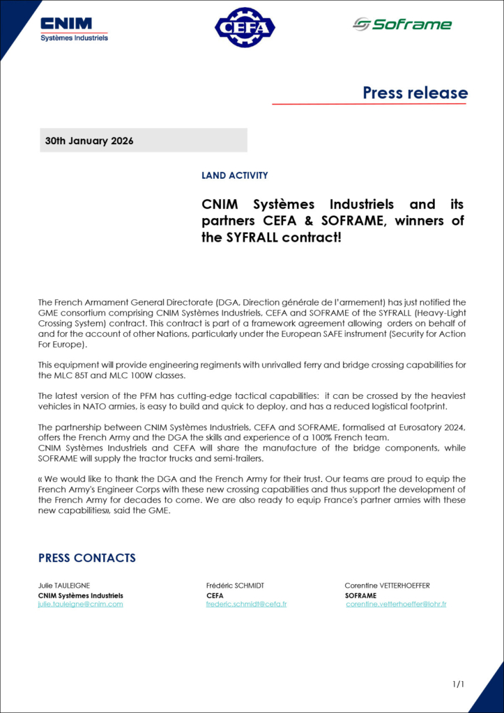 The French Armament General Directorate (DGA, Direction générale de l’armement) has just notified the GME consortium comprising CNIM Systèmes Industriels, CEFA and SOFRAME of the SYFRALL (Heavy-Light Crossing System) contract. This contract is part of a framework agreement allowing orders on behalf of and for the account of other Nations, particularly under the European SAFE instrument (Security for Action For Europe).