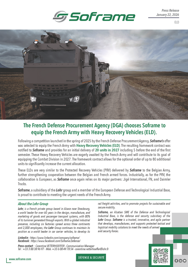Following a competition launched in the spring of 2025 by the French Defense Procurement Agency, Soframe’s offer was selected to equip the French Army with Heavy Recovery Vehicles (ELD). The resulting framework contract was notified to Soframe and provides for an initial delivery of 20 units in 2027 including 5 before the end of the first semester. These Heavy Recovery Vehicles are eagerly awaited by the French Army and will contribute to its goal of equipping the Combat Division in 2027.